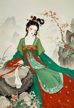 Gongbi, traditional Chinese attire, Tang dynasty, woman in elaborate green and red robe, intricate floral patterns, holding a delicate round fan, long black hair adorned with ornate hairpins, seated on a rock with blooming flowers, soft lighting, serene and elegant mood, detailed and refined brushwork.