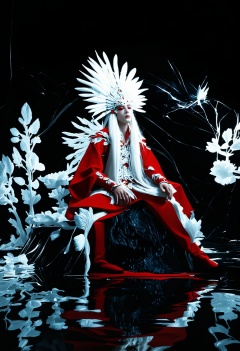 Surreal, fantasy-inspired, elaborate costume, seated figure, intricate headdress, red and white attire, long white hair, dramatic lighting, high contrast, dark background, ethereal atmosphere, reflective materials, floral elements, mystical ambiance, central composition, contemplative pose, artistic expression.