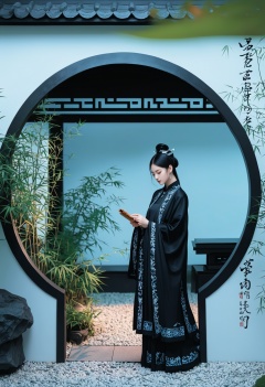 Inspired by traditional Chinese art, a woman in Hanfu reads a scroll in a moon gate garden, intricate black robe with silver embroidery, serene expression, soft blue lighting, bamboo plants, stone path, circular doorway, calligraphy on scrolls, tranquil and contemplative mood.