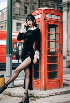 Cosplay, a woman in a black velvet dress with lace cuffs and collar, thigh-high slit, black stockings, and heels, leaning against a weathered, red phone booth, soft natural light, relaxed pose, slightly tilted head, serene expression, outdoor setting, vibrant colors, vintage aesthetic.