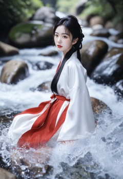 Photograph, young woman in traditional Chinese attire, red and white fur-trimmed robe, seated on rocks by a flowing stream, soft natural light, serene expression, long dark hair, delicate petals floating in the water, blurred background with rocks, ethereal and tranquil atmosphere.