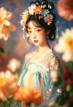 Inspired by traditional Chinese portraiture, ethereal woman in ornate Hanfu, delicate floral headpiece, soft lighting, dreamy ambiance, gentle pose, surrounded by vibrant flowers, close-up shot, warm and cool light interplay, serene and mystical mood, intricate details in fabric and accessories, captivating gaze.
