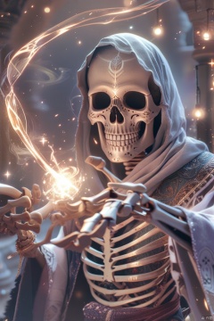 CG效果, 用手施放魔法咒语,周围环绕着发光的能量和魔法效果,魔法效果,特写,V,想象一个异想天开的幻想世界,一个空灵而怪异的戴头巾的骨架占据中心舞台。想象一下,亡灵有着淘气的魅力,它的眼睛反射出明亮的半透明暗红色光芒。V姿势,非常详细,高清,RAW照片,杰作,顶级品质,最佳品质,官方艺术,最高细节,大气照明,电影构图