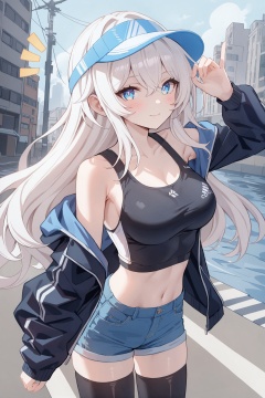 line art,line style,street,river,cityscape,1girl,solo,blue eyes,white hair,long hair,hair between eyes,medium breasts,midriff,open jacket,sportswear,denim shorts,visor cap,sunglasses,black thighhighs,light blush,looking at viewer,light smile,notice line,hand up,pov,close-up,dutch angle,masterpiece,bestquality,
