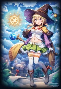 1girl, haniwa ornament, hat, eyelashes, blue sky, looking afar, gloves, yellow choker, upper teeth only, boots, staff, thighhighs, teeth, full body, hair between eyes, thighlet, fantasy, purple sleeves, sky, looking ahead, thigh strap, holding orb, long bangs, grey footwear, witch hat, parted lips, tree, belt, choker, medium breasts, grey hair, white thighhighs, skirt, sparkle print, wizard hat, long sleeves, white gloves, rooftop, hat feather, tassel, white belt, layered skirt, yellow hat, purple eyes, floating object, magic, midriff, light blush, ankle boots, standing, arm at side, navel, green skirt, twitter username, cloud, collar, short eyebrows, solo, ribbon-trimmed skirt, sparkle, black border, strapless, black ribbon, copyright notice, orb, ribbon-trimmed vest, belt boots, sidelocks, miniskirt, cape, collarbone, ribbon, sideways glance, ribbon trim, star hair ornament, palm tree, low twintails, footwear ribbon, print headwear, holding staff, two-tone headwear, white sleeves, hair ribbon, cloudy sky, short bangs, outside border, standing on one leg, arm strap, blonde hair, starry background, twintails, logo, arthrop kirara beatrtu \(cosplay\), white vest, yellow cape, boheborrowning california illusion \(slovuck\), tube gloves, star \(symbol\), sleeves pastelbow mini, border, fence, holding, cloud print capelet, cosplay button, hair ornament, elbow, blue background, buckle, gyaru, breasts, red bow, short hair, orange ribbon, vest, zetta stomach cutout, white bow, brown belt, hand updo, gold brace, footwear, looking down, single horizontal stripe bow, red bag, sun symbol in eye, sun symbol, black bag, masterpiece, best quality, absurdres, safe