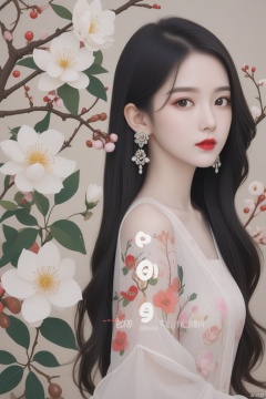 minguofeng,masterpiece,best quality, 1girl, black eyes, black hair, branch, brown eyes, daisy, dandelion, earrings, fingernails, floral background, flower, fur, jewelry, leaf, lily of the valley, lily pad, lipstick, long hair, looking at viewer, makeup, nail polish, pink flower, red lips, solo, upper body, white flower, white rose, illustration,cheongsam,hand painting,simple single background,