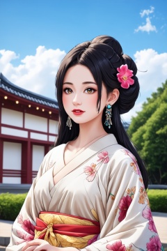 A young Japanese woman, adorned with traditional kanzashi hair ornaments and jewelry, poses against the backdrop of a serene blue sky and lush greenery. Her long black hair is styled in an intricate updo, featuring a hair flower at the crown. She wears a beautiful kimono with a floral print, its pale fabric contrasting with her porcelain-like skin. Blurred slightly to emphasize her beauty, she gazes straight ahead, her red lips painted with a subtle shine and her dark eyes lined with elegant eyeshadow. A delicate building or temple rises from the background, echoing the Japanese architecture that surrounds her.,Cartoon