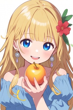 杰作,最高质量,1girl, blonde hair, long hair, earrings, solo, jewelry, holding, frills, blue eyes, upper body, looking at viewer, flower, fruit, food, holding food, frilled shirt, plant, shirt, white background, weibo username, simple background, blue shirt, holding fruit, smile, collarbone, yellow background, weibo logo, leaf, aqua shirt, bare shoulders