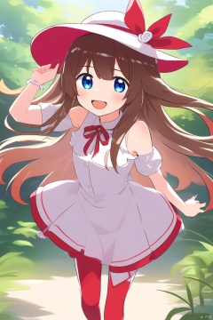 杰作,最高质量,1girl, blue_eyes, brown_hair, dress, full_body, hat, long_hair, looking_at_viewer, off_shoulder, red_legwear, smile, solo, sun_hat, thighhighs, white_dress, white_headwear