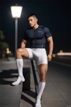 jzns,bikesuit, 1man, male focus,exquisite facial,handsome,charming eyes,solo,asian,short hair, black hair, outdoors, blurry, muscular,white tight short_sleeves,white bike shorts,kneehigh socks,kneehighs,footwear,moody lighting,blurry,at night, Bokeh, imposing, highly color focused, enchanted, flowing, beautiful detailed supreme quality color intricate,masterpiece, realistic, best quality, highly detailed,jm,ztg