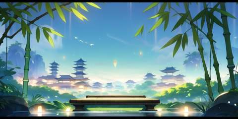 <lora:gmic icon_changjibngv2-000016:1>,gmic icon_\(sence\), a bench in a forest with a pond and trees in the background at night time with lights on the bench, bamboo, bamboo forest, blinds, blurry foreground, branch, dappled sunlight, day, falling leaves, flower, flower pot, foliage, grass, green theme, ivy, jungle, leaf, leaf background, letterboxed, lily of the valley, lily pad, long hair, morning glory, moss, mushroom, nature, no humans, outdoors, overgrown, palm leaf, palm tree, pine tree, pond, potted plant, rain, ruins, scenery, stone lantern, sunlight, sunset, tanabata, tanzaku, tombstone, tree, tree shade, vase, vines