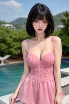 1girl, solo,face,((Blunt bangs,White eyes)), breasts, ((large breasts, cleavage)),((outdoors,shore:1.1)),looking at viewer,pink swimsuit,