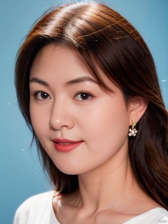 1girl, solo, looking at viewer, smile,  brown hair,  brown eyes, jewelry, closed mouth, upper body, earrings, lips, blue background, portrait, realistic, nose