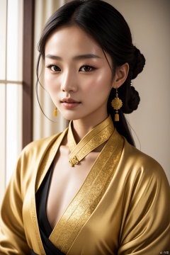 A stunning Chinese girl wearing an exquisite Ming Dynasty Hanfu, bathed in gentle natural lighting that highlights her delicate features. Her skin, characterized by natural imperfections and a warm, yellow-toned hue, is sprinkled with fine gold powder that adds a touch of ethereal beauty. The pores on her skin are subtly visible, contributing to her authentic and raw allure. Her complexion is naturally flushed, exuding a nude, unadorned tone. Her eyes, devoid of heavy makeup and eyeliner, look naturally beautiful, complementing her overall minimalistic and natural look.