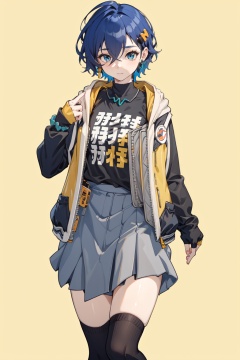 <lora:Belle:0.8>,Belle CYQL,1girl,looking at viewer,solo,blue hair,short hair,hair between eyes,blue eyes,jewelry,hair ornament,earrings,hood,jacket,black shirt,long sleeves,open clothes,open jacket,multicolored clothes,fingerless gloves,wrist scrunchie,grey skirt,asymmetrical legwear,single kneehigh,single sock,shoes,(cowboy_shot:1.3),(yellow background:1.4),posing,masterpiece,best quality,beautiful and aesthetic,