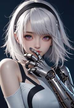 1girl,solo,looking at viewer,medium hair,bangs,hairband,purple eyes,hair ornament,hair between eyes,white hair,fluffy hair,large_breasts,blush shy,shiny_skin,very detailed clothes,very realistic textures,very detailed textures,longeyelashes,brown eye shadow,night,dim light,cyberpunk,mechanical arm,sci-fi style clothes,hair_tucking,metal material,realistic metallic texture,hands,raise your hand,