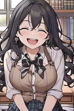 (masterpiece、Highest quality、Very detailed))、One girl、gyaru、Black Hair、Long Hair、Wavy Hair、Grey Eyes、evil smile、((open mouth))、((lots of piercing))、((Large Breasts))、((White collared shirt))、A bow tie、roll up sleeveicro miniskirt))、Cowboy Shot、Classroom Background