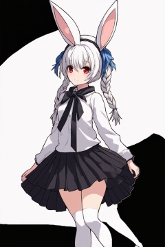 Shirayuki \(Azur Lane\),1girl, solo, long hair, looking at viewer, bangs, skirt, hair ornament, red eyes, thighhighs, long sleeves, holding, animal ears, blue hair, full body, braid, white hair, multicolored hair, pleated skirt, detached sleeves, japanese clothes, virtual youtuber, wide sleeves, black skirt, rabbit ears, hair over one eye, twin braids, white thighhighs, animal ear fluff, umbrella, thick eyebrows, black background, single thighhigh, machinery, rabbit, turret, holding umbrella, short eyebrows, rabbit girl, cannon, rigging, oil-paper umbrella, torpedo, fur scarf, torpedo tubes, teruterubouzu, usada pekora, don-chan \(usada pekora\),Watercolor,anime girl,anime style,ek_ani_b00ster,ek_real_b00ster