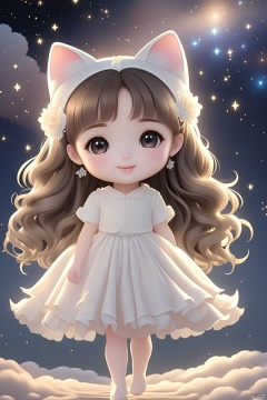 杰作,米鲁莫,1个可爱的女孩,猫耳,韩式女发,白色公主裙,夜晚,星空,可爱的场景,柔和的光影,3D建模