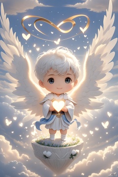 杰作,丘比特,1个可爱的小男孩,白色短发,希腊服饰,天使翅膀,漂浮在空中,伊甸园,漂浮的爱心,双手捧着水晶之心,精致的画面,奇幻的场景,柔和的光影,3D建模