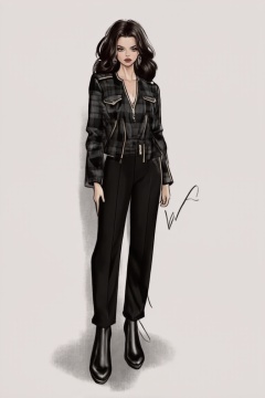 women. beautiful detailed face, black hair, pale skin, light skin, realistic skin, detailed fabric texture, detailed hair texture, perfect proportion, accurate, anatomically correct, highly detailed skin and face texture, modern, photorealistic, perfect face, hyper realism, mega realism, high quality. modern flannel, rock music style. messy hairstyle. whole body. black pants, black boots,digital art,Fashion drawing