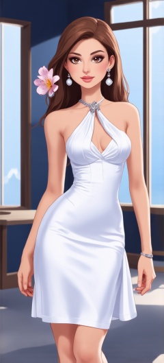 A stunning young woman stands confidently in a luxurious indoor setting, her piercing brown eyes locked onto the viewer. Her long, luscious brown hair cascades down her back like a waterfall, as she wears a fitted white halter-neck dress that accentuates her toned physique and medium-sized breasts. Her bare shoulders gleam in the soft light, adorned with delicate jewelry - a ring on her finger, earrings dangling from her lobes. The dress cinches at her waist, highlighting her curves as she stands tall in high heels. A single flower rests against her chest, its petals unfolding like a secret message. The overall atmosphere is one of elegance and sophistication, with the subject exuding confidence and poise.,Realistic Enhance,Cartoon