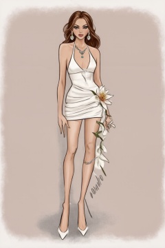 women. A stunning young woman stands confidently in a luxurious indoor setting, her piercing brown eyes locked onto the viewer. Her long, luscious brown hair cascades down her back like a waterfall, as she wears a fitted white halter-neck dress that accentuates her toned physique and medium-sized breasts. Her bare shoulders gleam in the soft light, adorned with delicate jewelry - a ring on her finger, earrings dangling from her lobes. The dress cinches at her waist, highlighting her curves as she stands tall in high heels. A single flower rests against her chest, its petals unfolding like a secret message. ,digital art,Fashion drawing