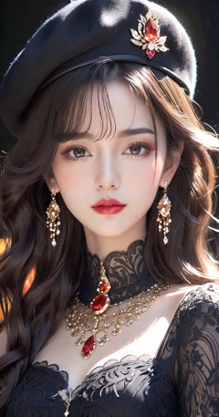 1girl, solo, long hair, breasts, looking at viewer, black hair, gloves, hat, dress,brown eyes, jewelry, medium breasts, upper body, earrings, parted lips, choker, black gloves, artist name, necklace, black dress, black headwear, makeup, beret, lipstick, black background, gem, red lips, lace gloves