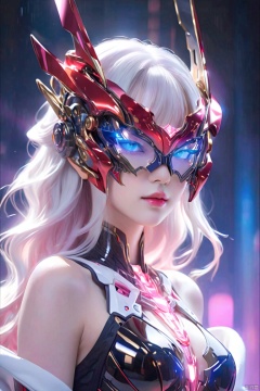 Dimensional Armory,wearing black and red, Anime girl in bare-shoulder dress,with long white hair,wearing black glasses frame,glowing pink special effects,gradient blue and pink Lights,light blue background,rich details,Expose the mechanical mask of the eyes,ultra high resolution,32K UHD,best quality,masterpiece,