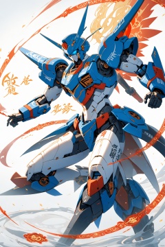 magic effect, Surrounded by rotating transparent red scrolls, floating transparent red Chinese characters, dynamic, rotating, 1 man standing in the air, not looking at the camera, writing calligraphy, solo, blue eyes, holding, weapon, holding weapon, glow, robot, mecha, science fiction, open_hand,v-fin, movie lighting, strong contrast, high level of detail, best quality, masterpiece