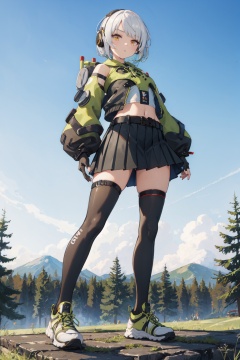 <lora:Anby-000020:0.88>,Anby CYQL,1girl,looking at viewer,solo,short hair,white hair,headphones,yellow eyes,jacket,midriff,long sleeves,detached sleeves,gloves,black gloves,fingerless gloves,navel,skirt,pleated skirt,black skirt,belt,thighhighs,black thighhighs,shoes,sneakers,green footwear,blush,bust,Towering millennium-old pines stand tall and robust, their needles blanketing the ground, soft underfoot. The air is suffused with the fresh scent of pine resin,beautiful detailed sky,beautiful detailed glow,posing in front of a colorful and dynamic background,masterpiece,best quality,beautiful and aesthetic,contrapposto,female focus,wallpaper,