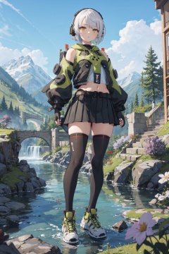<lora:Anby-000020:0.88>,Anby CYQL,1girl,looking at viewer,solo,short hair,white hair,headphones,yellow eyes,jacket,midriff,long sleeves,detached sleeves,gloves,black gloves,fingerless gloves,navel,skirt,pleated skirt,black skirt,belt,thighhighs,black thighhighs,shoes,sneakers,green footwear,Tsundere,upper_body,Trickling through the mountains, the clear stream allows a view of its pebbled bed, surrounded by clusters of wildflowers along its banks and moss-covered rocks. Occasionally,beautiful detailed sky,beautiful detailed glow,posing in front of a colorful and dynamic background,masterpiece,best quality,beautiful and aesthetic,contrapposto,female focus,wallpaper,