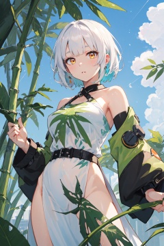 <lora:Anby-000020:0.6>,Anby CYQL,1girl,looking at viewer,solo,short hair,white hair,yellow eyes,(Halter-neck maxi dress in a tropical print:1.3),(yandere:1.2),(bust:1.3),With the drizzle subsiding, bamboo leaves are adorned with glistening droplets, and the air is so fresh it feels tangible. Sunlight pierces through sparse clouds, casting dappled shadows on the verdant bamboo stalks,beautiful detailed sky,beautiful detailed glow,posing in front of a colorful and dynamic background,masterpiece,best quality,beautiful and aesthetic,contrapposto,female focus,wallpaper,