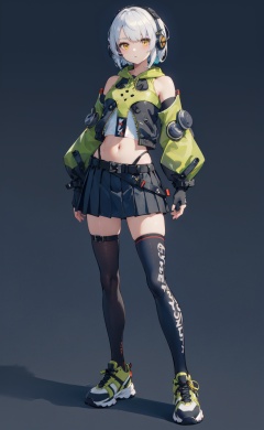 (darkslateblue background:1.4),<lora:Anby-000020:0.8>,Anby CYQL,1girl,looking at viewer,solo,short hair,white hair,headphones,yellow eyes,jacket,midriff,long sleeves,detached sleeves,gloves,black gloves,fingerless gloves,navel,skirt,pleated skirt,black skirt,belt,thighhighs,black thighhighs,shoes,sneakers,green footwear,posing,masterpiece,best quality,beautiful and aesthetic,
