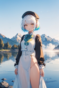 <lora:Anby-000020:0.6>,Anby CYQL,1girl,looking at viewer,solo,short hair,white hair,yellow eyes,(Vintage-inspired ensemble with a shirtwaist dress, bow-tie, and pillbox hat:1.3),(naughty_face:1.2),(panorama:1.3),As the first light of dawn appears, the lake is veiled in a thin layer of mist, with faint outlines of mountains merging with their reflections in the water,beautiful detailed sky,beautiful detailed glow,posing in front of a colorful and dynamic background,masterpiece,best quality,beautiful and aesthetic,contrapposto,female focus,wallpaper,