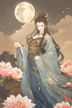 (Masterpiece:1.2), best quality,1girl, looking_at_viewer,(big breasts:1.5),Xyaoye,Large aperture, blurred background, spring scene,flowers,Xsimiaoling,(Peony,full moon:1.23),Xbaiyuerong