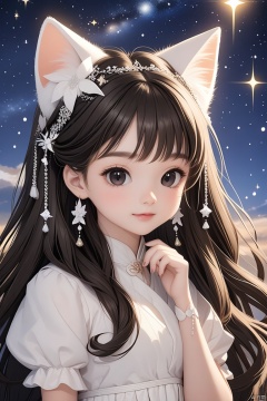 杰作,米鲁莫,1个可爱的女孩,猫耳,韩式女发,白色公主裙,夜晚,星空,可爱的场景,柔和的光影,3D建模