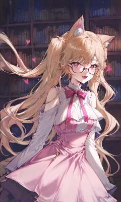 masterpiece,best quality,ultra-detailed,very aesthetic,absurdres,1girl,solo,cat mouth,cat mouth,cat mouth,cat smile,heart-shaped pupils,glasses,very long hair,blonde hair,cat_ears,pink_dress,library,