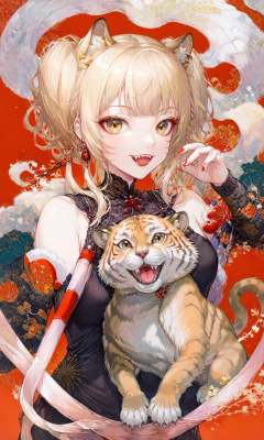 masterpiece,best quality,ultra-detailed,very aesthetic,absurdres,1girl,red background,blonde hair,long hair,bangs,earrings,jewelry,open mouth,tiger,looking at viewer,solo,fangs,chinese zodiac,smile,simple background,blunt bangs,teeth,chinese clothes,upper body,animal,year of the tiger,yellow eyes,red lips,holding,tongue,makeup,(full_body:1.2),