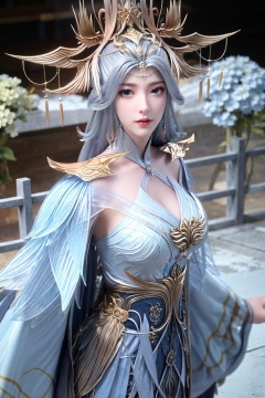 masterpiece,(best quality),official art,extremely detailed cg 8k wallpaper,(extremely delicate and beautiful),solo,realistic,photo_\(medium\),chinese clothes,blue dress,1girl,solo,blue eyes,earrings,mole,white hair,armor,crown,mole under eye,,Xningyudie,(big_breasts:1.39), Yunxiao_Fairy,X-Hydrangea, hanfu,(full moon,Hydrangea:1.29)