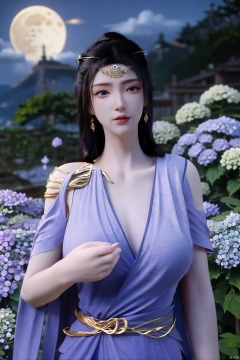(Masterpiece:1.2), best quality,1girl,blue eyes,long white hair,silver crown,armor,headwear,gufeng,half body photo,petal,real,photo realistic,highly detailed,(masterpiece),(high quality),best quality,super detailed,full detail,4k,8k,(big breasts:1.39),X-Hydrangea,(full moon,Hydrangea:1.29),Xwensiyue