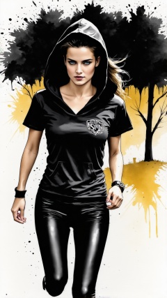 a beautiful 20yo model girl standing running in a park,detailed exquisite face,Kristen stewart lookalike,hood t-shirt and leggings,medium breasts,perfect female form,[model body],