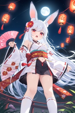 1girl, night, lantern, rabbit ears, animal ears, white socks, hand fan, paper lantern, detached sleeves, long hair, socks, moon, red eyes, full moon, solo, holding fan, folding fan, night sky, white hair, holding, wide sleeves, looking at viewer, open mouth, navel, sky, hair ornament, sash, clothing cutout, very long hair, long sleeves, white sleeves, bare shoulders, from below, outdoors, kneehighs, teeth, obi, japanese clothes, rabbit girl, feet out of frame, hair flower, navel cutout, animal ear fluff, flower, star \(sky\), standing, small breasts, ribbon trim, breasts