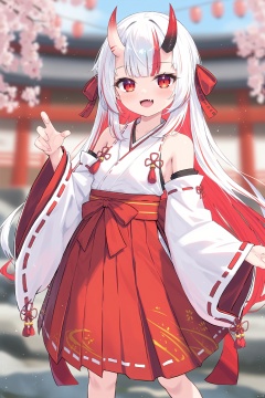 1girl, solo, long hair, looking at viewer, smile, open mouth, bangs, skirt, red eyes, long sleeves, bare shoulders, very long hair, standing, white hair, :d, red hair, multicolored hair, small breasts, outdoors, detached sleeves, japanese clothes, horns, sleeveless, fang, virtual youtuber, wide sleeves, blurry, streaked hair, blurry background, feet out of frame, ribbon trim, hakama skirt, ribbon-trimmed sleeves, oni horns, sheathed, oni, white kimono, miko, nakiri ayame
