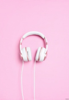 The image depicts a pair of headphones placed against a pastel pink background. The headphones are white with a soft pink accent on the ear cups and the headband. The ear cups have a cushioned texture, and the headband is padded for comfort. The wires are white and appear to be of a standard length, typical for wired headphones. The overall presentation of the headphones is clean and minimalistic, with a modern aesthetic.