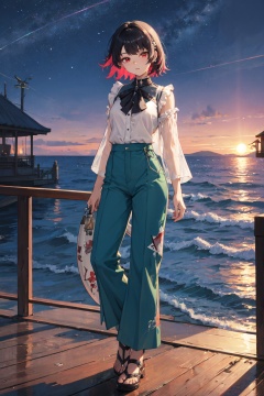 <lora:Ellen-000010:0.8>,Ellen CYQL,1girl,looking at viewer,solo,shark girl,short hair,black hair,red hair,multicolored hair,colored inner hair,red eyes,tail,shark tail,(Flowy_blouse:1.5),(Wide-leg_pants:1.4),(Espadrille_wedges:1.3),(Seaside_pier_background:1.4),naughty_face,upper_body,Street performers, Artists, Musicians, Entertainers, Crowds,(Gum trees, Eucalyptus scent, Australian outback, Sunrise hues, Gum tree silhouettes, Outback landscape:0.5),beautiful detailed sky,beautiful detailed glow,posing in front of a colorful and dynamic background,masterpiece,best quality,beautiful and aesthetic,contrapposto,female focus,wallpaper,