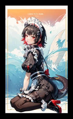 <lora:Ellen-000010>,Ellen CYQL,1girl,looking at viewer,solo,shark girl,short hair,black hair,red hair,multicolored hair,colored inner hair,maid headdress,red eyes,maid,wrist cuffs,short sleeves,puffy sleeves,red nails,apron,maid apron,dress,black dress,frills,tail,shark tail,fins,pantyhose,black pantyhose,black footwear,(giggling:1.2),beautiful face,beautiful eyes,glossy skin,shiny skin,(portrait,front view,wariza:1.2),adjusting eyewear,Canopy bed with fairy lights, Sheer curtains, Dreamcatchers, Cloud wall decals, Star projector,beautiful detailed sky,beautiful detailed glow,(English text:1.3),(border:1.5),posing in front of a colorful and dynamic background,(masterpiece, best quality, beautiful and aesthetic:1.3),contrapposto,female focus,fine fabric emphasis,wallpaper,fashion,Lipstick,depth of field,intricate_detail,finely_detailed,fine_fabric_emphasis,(glossy),<lora:增强减少细节add_detail:0.4>,