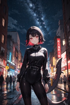 <lora:Ellen-000010:0.8>,Ellen CYQL,1girl,looking at viewer,solo,shark girl,short hair,black hair,red hair,multicolored hair,colored inner hair,red eyes,tail,shark tail,,smirk,upper_body,City light show, Illumination, Night view, Spectacle, Beauty,(Bonsai trees, Moss, Gravel pathways, Raked sand, Tranquility, Meditation:0.5),beautiful detailed sky,beautiful detailed glow,posing in front of a colorful and dynamic background,masterpiece,best quality,beautiful and aesthetic,contrapposto,female focus,wallpaper,