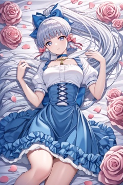 score_9,score_8_up,score_7_up,score_6_up,score_5_up,score_4_up,source_anime,source_cartoon,<lora:kamisato ayakaTponyXL-000008:1>,kamisato ayaka, 1girl, solo, flower, short sleeves, grey eyes, bow, rose, skirt, long hair, lying, on back, blunt bangs, looking at viewer, puffy sleeves, shirt, white shirt, hair bow, pink flower, parted lips, blunt tresses, puffy short sleeves, breasts, blue bow, ponytail, pink rose, alternate costume, grey hair, choker, frills, high-waist skirt, hand up, feet out of frame, ribbon, hair ribbon, cross-laced clothes, blue choker, tress ribbon, blue skirt, sidelocks, grey hair, medium breasts, petals, grey hair