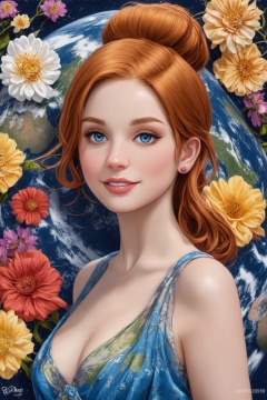 (1girl, smile, face focus, bun hair, perfect face, medium shot, gracefully, 2 different colors of petals to flowers form intricate patterns against the backdrop of the earth, reminiscent of the styles of Da Vinci), Detailed texture, High quality, High resolution, High precision, Realism, Color correction, Proper lighting settings, Harmonious composition, Behance Works,detail-rendering,Realistic Enhance,redhead,Fashion drawing
